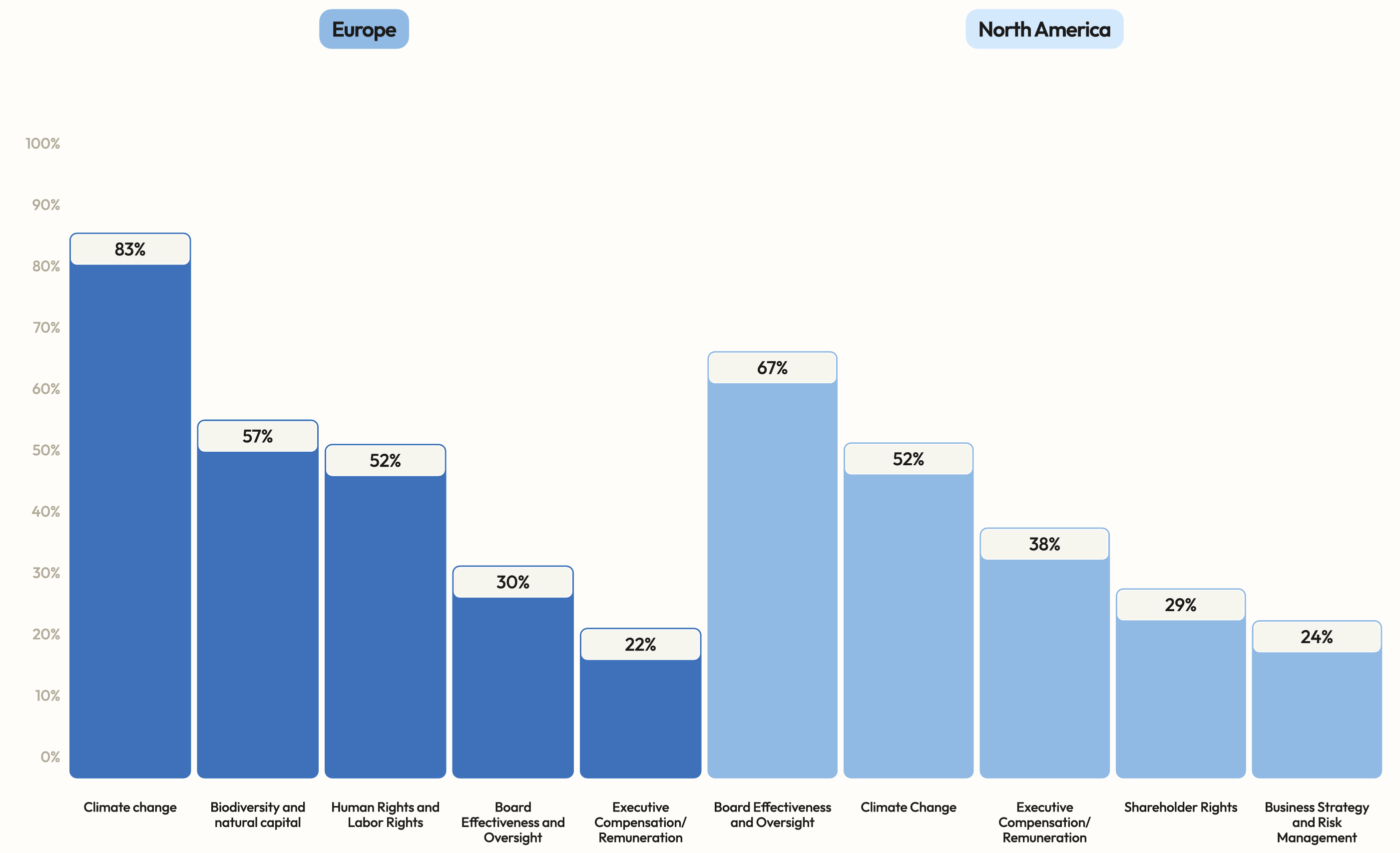 - Regional differences in priorities: European investors place greater emphasis on sustainability themes, while North American investors continue to focus more on traditional governance issues.