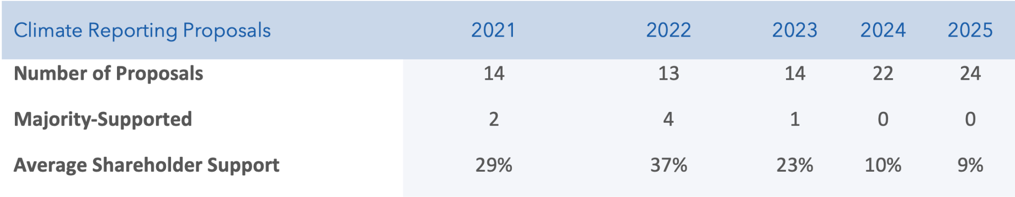 - Whereas average support remained static for shareholder proposals as a whole at 23%, it was cut in half for climate-related shareholder proposals, from 22% last year down to 11% in 2025.
