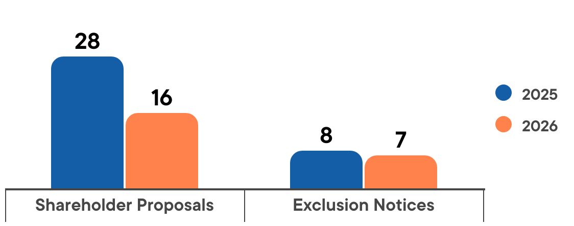 - Based on early incoming data, the number of shareholder proposals going to a vote in January and February 2026 is down from last year, while the number of exclusion notices filed is roughly the same.